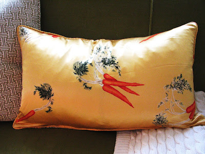 I've had this yellow carrot silk (below) for ages (7-8 years?) and have been meaning to do something with it ever since I purchased it.  It's now finally made its way into a special-occasion pillow.  (Special occasion because on most days we're not fit for silk on the sofa ;)